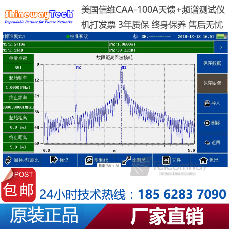 CAA-100A系列天馈线频谱测试仪是一款由信维科技®推出天线、馈线、电缆测试,射频功率测试,以及频谱分析测量的综合性仪器。CAA-100A的天馈功能能够测试基站天线和馈线的驻波比和匹配性及电缆损耗和长距离故障定位,快速评估传输线和天线系统的状况,缩短新基 站所 需 要的 安 装调 试 时 间;1MHz~4.4GHz超宽测试频率范围,60dB超大动态范围,多种选件功能广泛适用于2G/3G/4GWiFi等制式下测试。频谱分析模块覆盖频率范围300MHz-4GHz,100dB超大动态范围,-130dBm平均噪底@RBW=1kHz,提供频谱测试、干扰排查等测试。CAA-100系列25MHz~4GHz超宽测试频率范围,60dB超大动态范围,多种选件功能广泛适用于2G/3G/4G/WiMAX等制式下测试。CAA-100系列采用7寸超大触摸屏设计,8小时超长续航时间,用户体验极好。CAA-100系列是新一代无线网络建设、升级、维护必不可少的测量工具。
